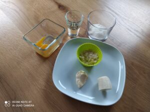 1. Wszystkie składniki odważyć i dokładnie z dobą wymieszać (banana rozetrzeć na masę)