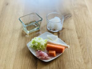 1. Warzywa umyć, obrać i osuszyć.  Mięso i warzywa po odważeniu pokroić na mniejsze kawałki